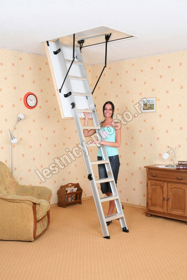 Лестница складная трехсекционная. Модель ALU PROFI идеальна для условий, когда чердак плохо утеплен и требует дополнительной теплоизоляции. Отличительной чертой лестницы ALUPROFI является легкая и чрезвычайно прочная лестница из алюминия высочайшего качества. Лестницы имеют нескользящие ножки, которые идеально прилегают к земле, предотвращают появление царапин на поверхности пола и придают лестнице эстетичный вид после ее резки.