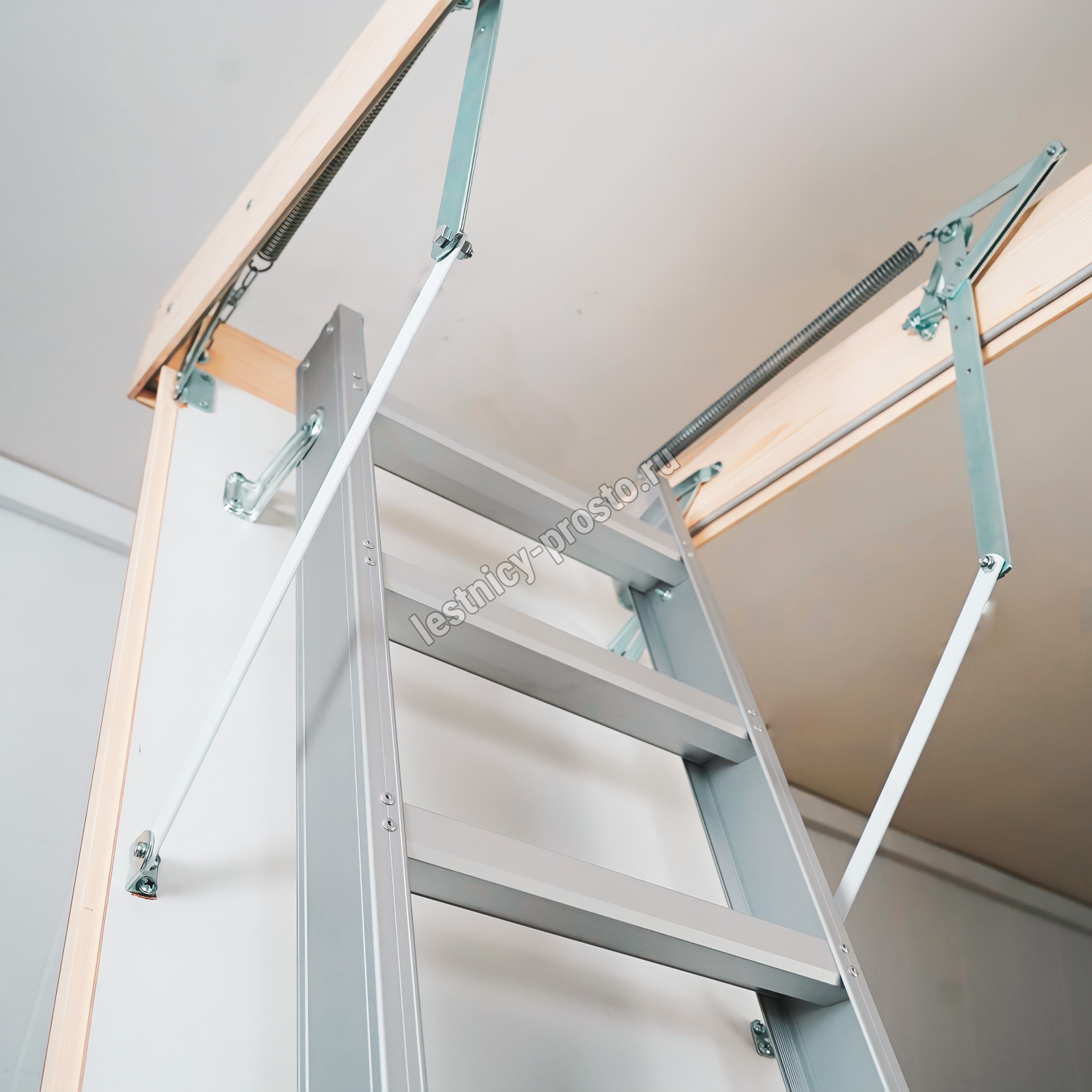 Лестница чердачная складная алюминиевая 3-х секционная. Ступени полностью выполнены из алюминия.