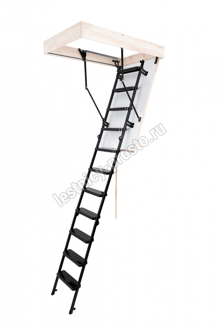 Лестница складная трехсекционная. Рабочая поверхность полностью выполнена из металла и покрашена порошковой краской. Термоизоляционная крышка типа "сэндвич", толщиной 30 мм, утеплена пенопластом, облицована с двух сторон ДCП белого цвета.