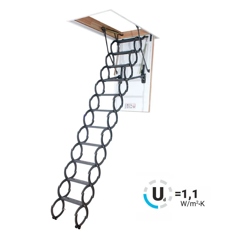 Металлическая чердачная лестница LST оснащена энергосберегающей термоизоляционной крышкой люка белого цвета. По периметру люка установлен контур уплотнения, обеспечивающий высокую степень герметичности. Благодаря «ножничной» системе складывания в сложенном виде лестница очень компактна и имеет небольшой размер крышки люка. S-образные боковые элементы лестницы выполняют роль поручней и придают лестнице современный вид.