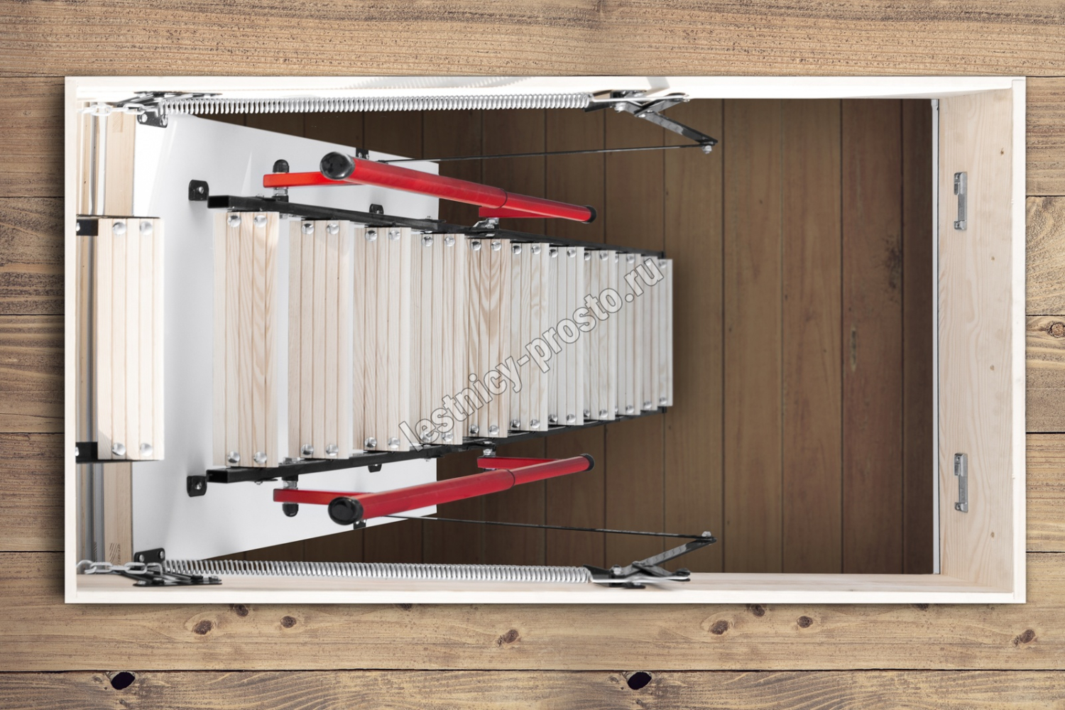 Лестница чердачная, складная, комбинированная 3-х секционная, металлические направляющие/деревянные ступени. Короб люка имеет двухточечную систему запирания. Телескопический поручень имеет внутреннюю пружину и при складывании лестницы служит механическим приводом, что облегчает процесс. Делает его полуавтоматическим. Оборудована дополнительной ступенькой на люке помогающей комфортно подниматься и спускаться. Термоизоляционная крышка типа "сэндвич", толщиной 86мм, утеплена пенопластом, облицована с двух сторон ДВП белого цвета. Лестница подходит для установки в местах с большими перепадами температур. Короб деревянный, высотой 170мм., по периметру проходит уплотнитель. Лестница выпускается для немецкого и английского рынка.