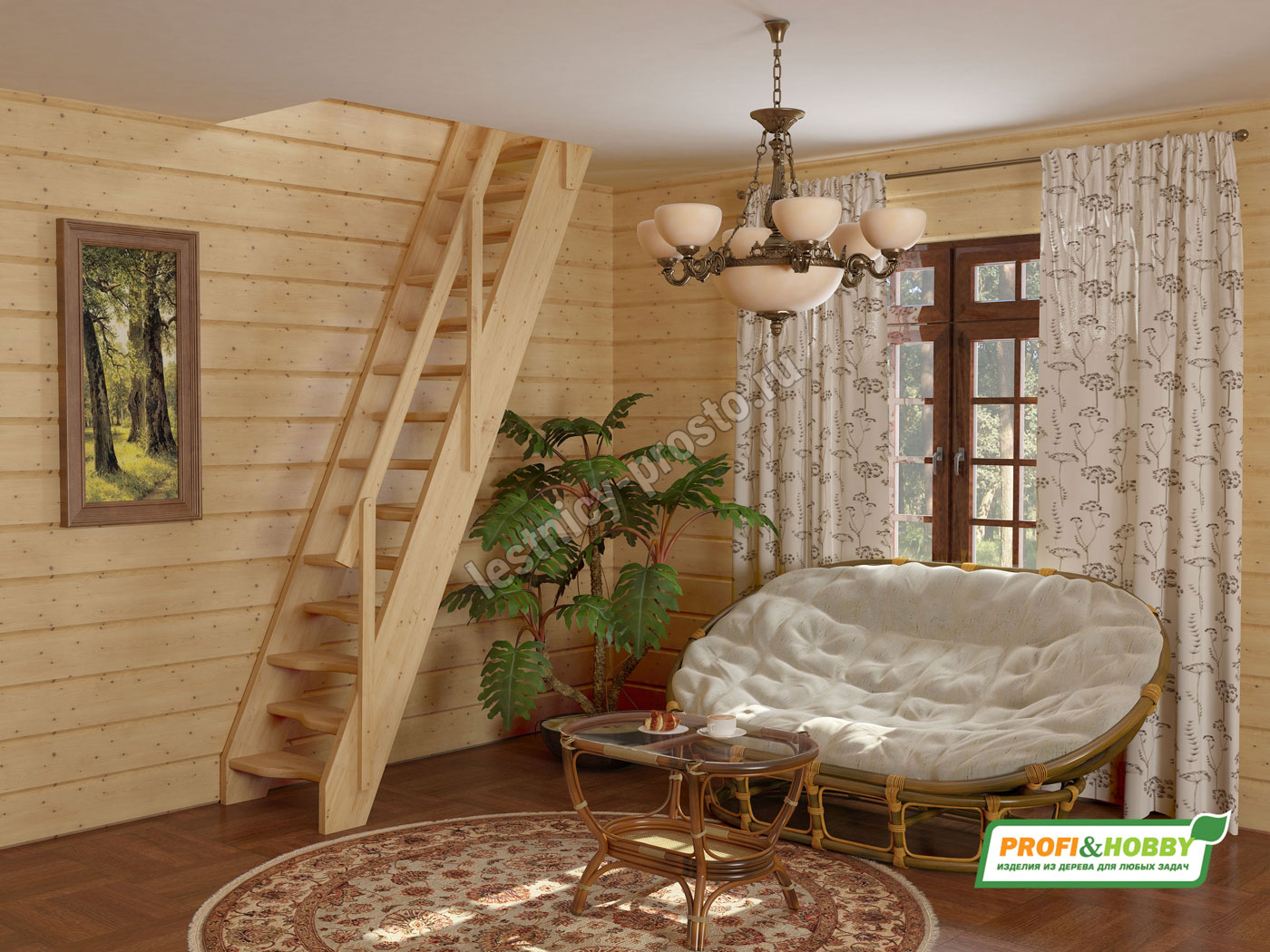 Базовый комплект включает в себя деревянные элементы лестницы и ограждения без какого-либо покрытия.