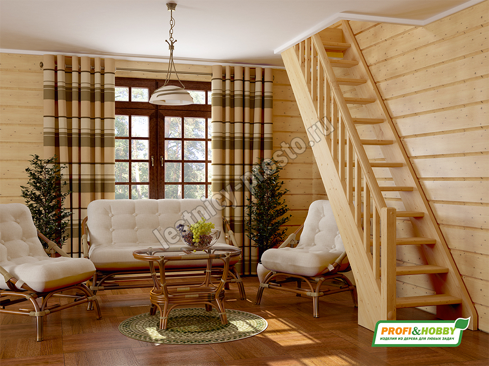 В производстве лестницы ЛС-10м под покраску используется сосна с небольшими изменениями цвета, что практически не влияет на ее механические свойства и почти незаметно при покраске в темные цвета. Базовый комплект включает в себя деревянные элементы лестницы и ограждения без какого-либо покрытия. Ограждение можно установить слева или справа.