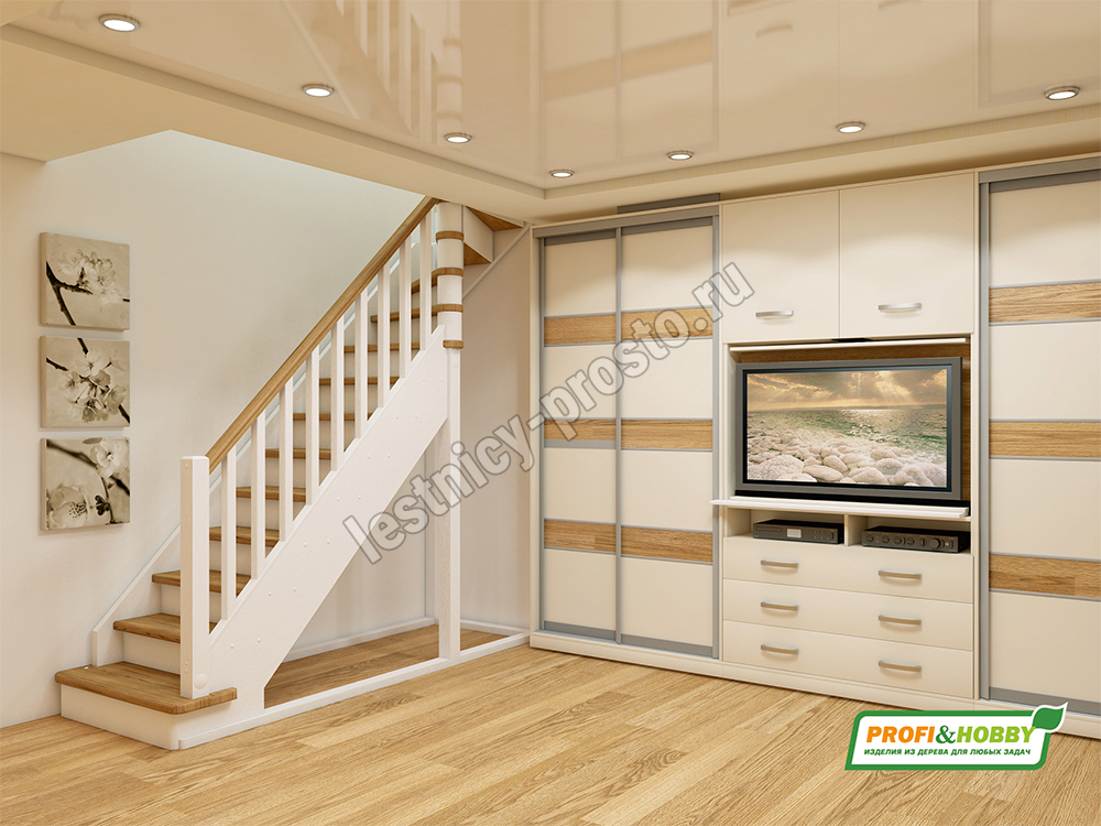 Ступени и поручень лестницы изготовлены из ясеня, остальные элементы из сосны.