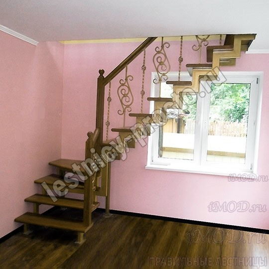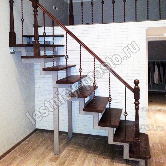 Деревянные элементы: столбы и поручень по умолчанию идут без окрашивания, металлические элементы окрашены в цвет каркаса лестницы. Ограждение начинается с пятой ступени. Комплект предполагает размещение по  одной стойке на ступень.