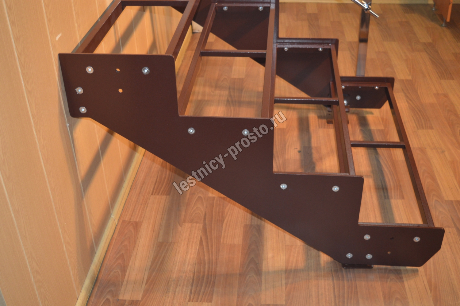 Покрытие порошковое, очень прочное и долговечное. Все детали каркаса крепятся с помощью болтов, благодаря чему Вы можете собрать каркас самостоятельно без применения сварки. В зависимости от ширины лестницы, каркас состоит из двух (ширина до 1 метра) или трех (ширина до 2 метров) опорных балок (тетив).