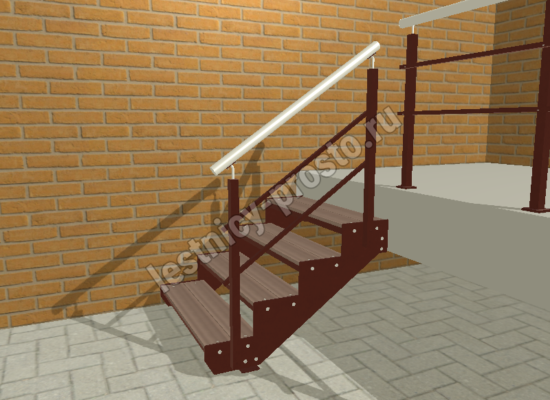 Ступени лестницы состоят из металлической рамки, обеспечивающей необходимую прочность, и покрытия из террасной доски ДПК (древесно-полимерный композит). Ступени не боятся воды и мороза, не теряют со временем свой внешний вид и не требуют ухода.