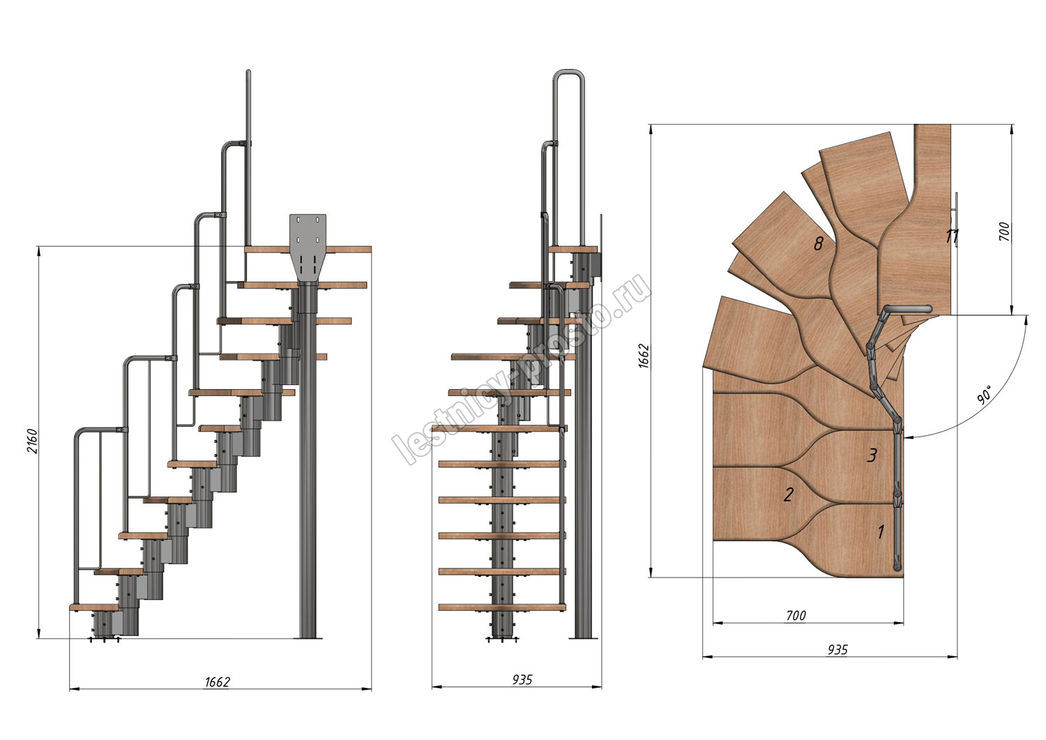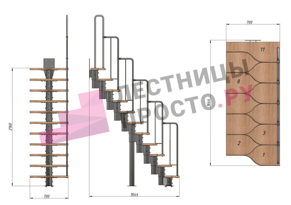 Лестница Prosto Urban Black гусиный шаг 700 мм, h198-288 см (11 ступеней), бук