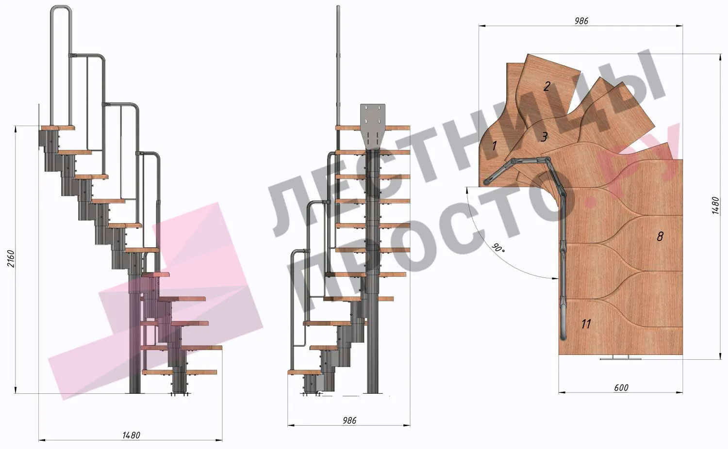 Лестница Prosto Urban Grey г-образная гусиный шаг 600 мм/ Ступени из берёзы мультиплекс