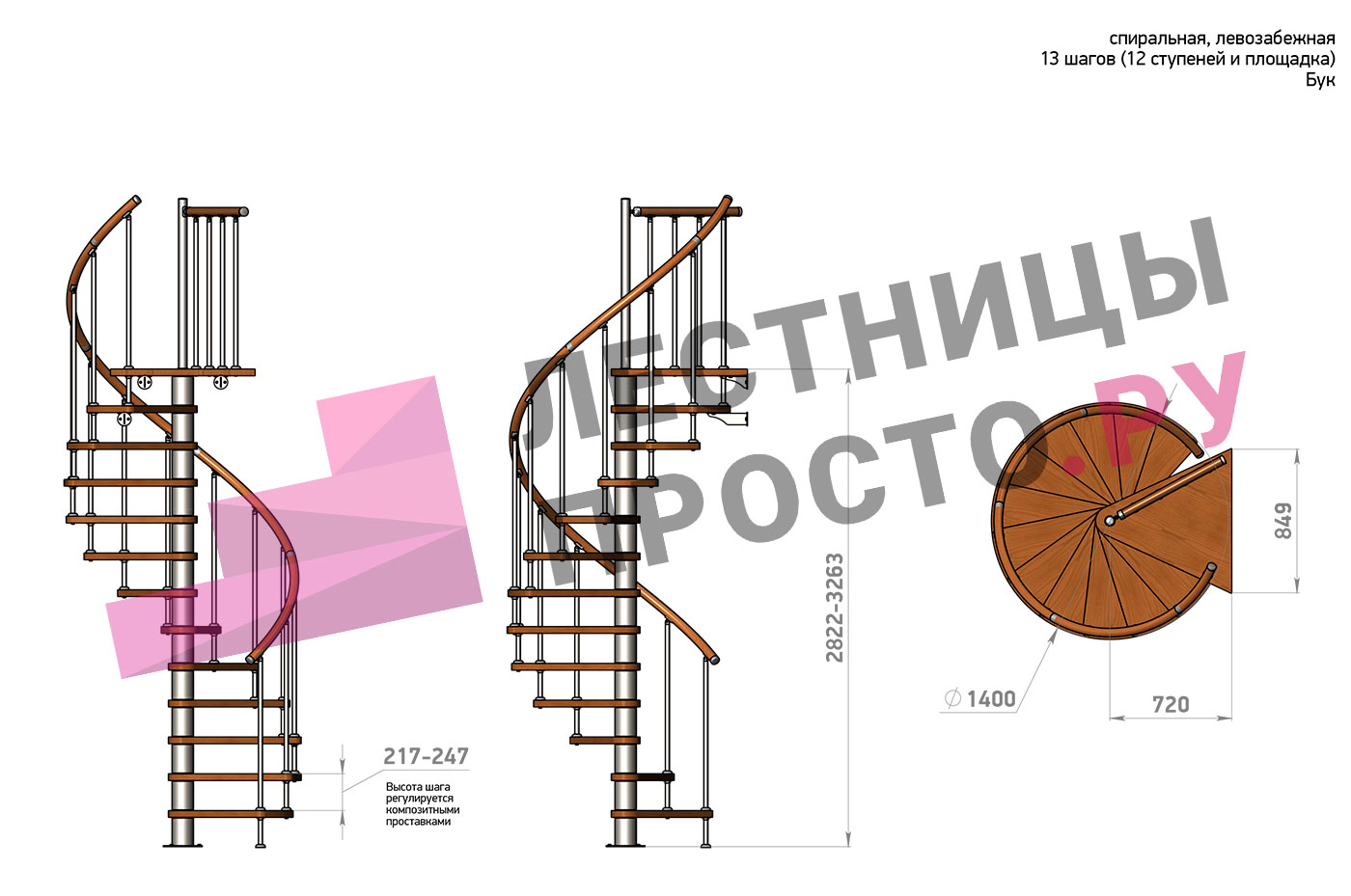 Ширина ступени между центральной колонной и поручнем ≈ 580 мм