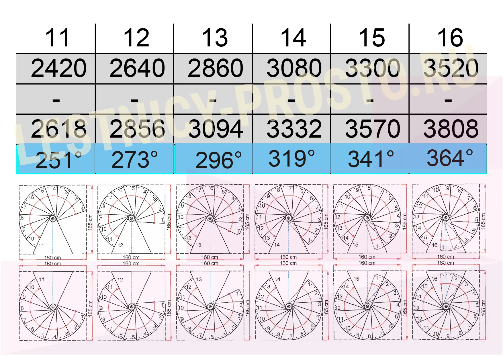 Параметры лестницы SPIRAL DECOR 160 с разным количеством ступеней
