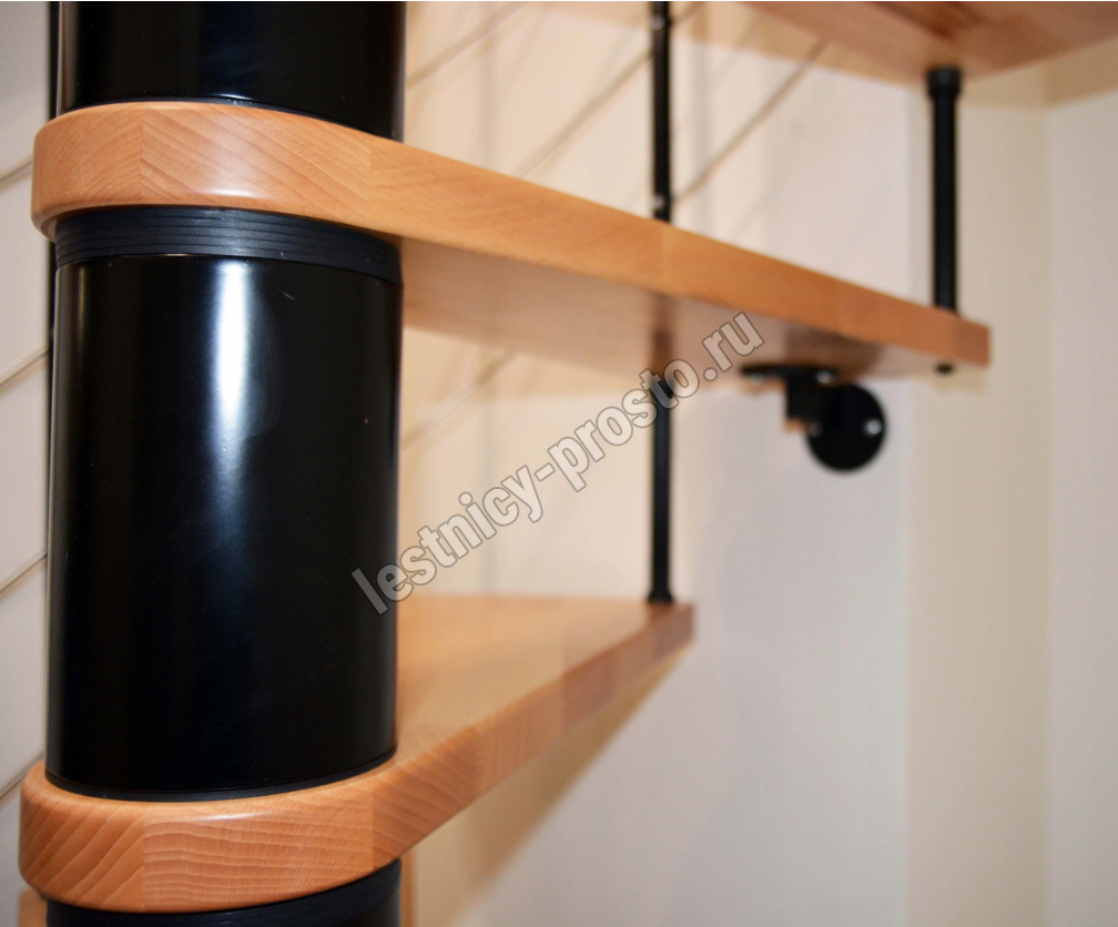 Ступени и поручень выполнены из сращенного бука и покрыты износостойким бесцветным защитным лаком. Все металлические детали с высококачественным порошковым покрытием. Каркас и металлические стойки серебристого цвета. Под заказ возможно изготовление лестницы другой расцветки.
