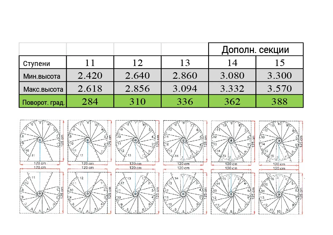 Возможные высоты лестницы с разным количеством ступеней