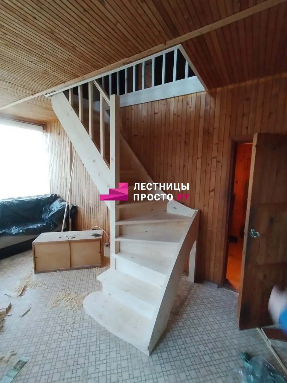 Лестница из сосны с поворотом и подступёнками для частного дома